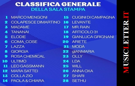 Dopo le prime due serate, ecco la classifica generale provvisoria scaturita dal voto della giuria della sala stampa, tv, radio e web.
