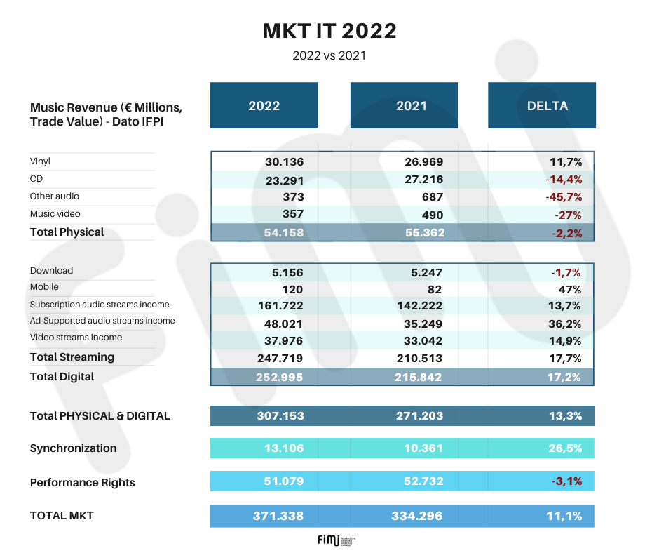 Il comparto fisico segna un generale -2,2% ma i vinili resistono, guidando una rimonta dell’11,7%: nonostante il calo del fisico sia una deriva naturale della digitalizzazione sempre più spinta del mercato italiano, grazie ai pregevoli risultati del repertorio locale che ha dominato le classifiche degli album e dei singoli nel 2022 il nostro mercato fisico resta uno dei più forti a livello internazionale, posizionandosi all’ottavo posto.